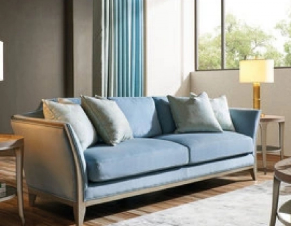 Трехместный диван на низких ножках выполнен в стиле неоклассика из массива дерева. Обтянут тканью из ассортимента фабрики, декорировано кантом.